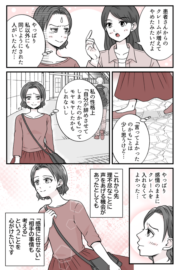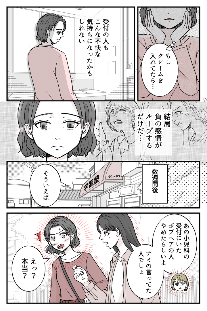 数週間後、娘を塾に送ったとき、ママ友のシオリと例の小児科の話になりました。あの受付の女性は退職したそうです。投げ捨てるように渡された処方箋や冷たい態度……。あのときの出来事が自然と思い出されました。やはり私だけが特別イヤな思いをしたわけではなかったのだと感じます。