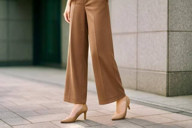 おすすめは、黒パンツ×黒ブーツ、ベージュパンツ×同系色のパンプスなどの“ワントーン仕上げ”。さらにヒールや厚底タイプを選べば、スタイルアップ効果は倍増します。なお、スニーカーを合わせる場合は、パンツの丈を少し短めにして足首を見せると抜け感が出て、軽やかさも演出できます。