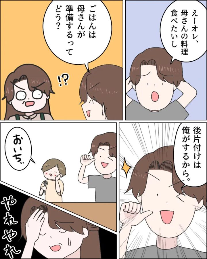 「えーオレ、母さんの料理食べたいし。ご飯は母さんが準備するってどう?後片付けは俺がするから。」ショウは、さも良い提案をしているかのように言いました。自分でするという選択肢のない息子。育て方、間違ったかしら。ルールを守って欲しい気持ちはありましたが、ショウや、ショウのとなりで「おいちぃ」とご飯をモリモリ食べているコウくんを見ていたら、このまま頑なにルールを優先してご飯をアミちゃんに任せると、健康の方が心配になってきてしまいました。