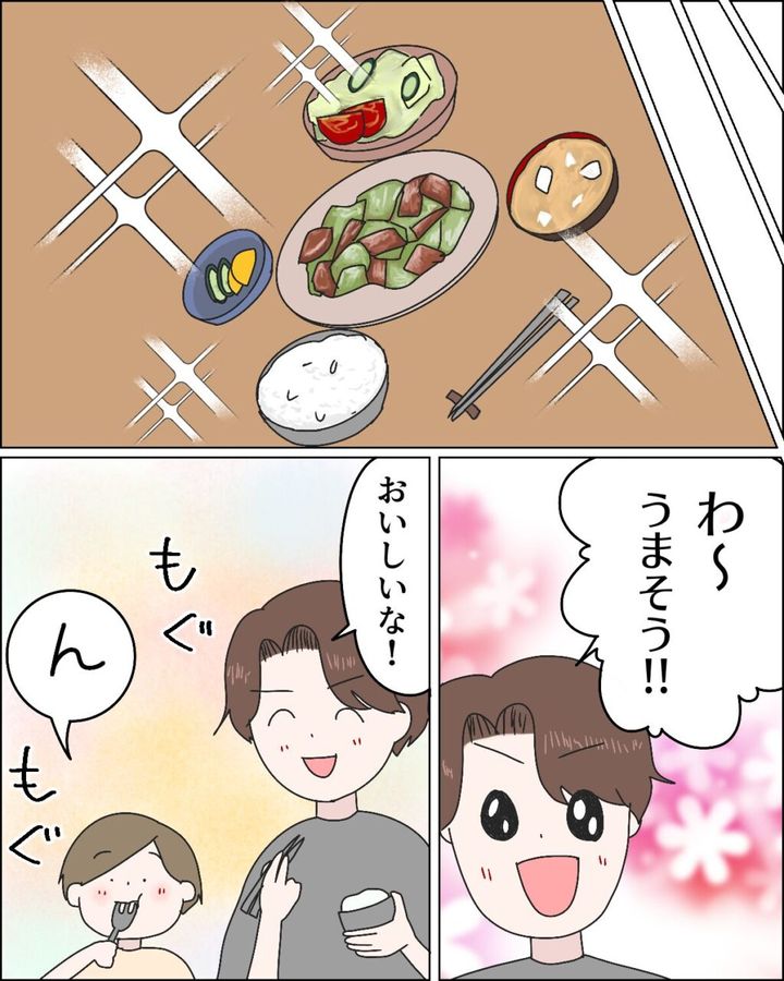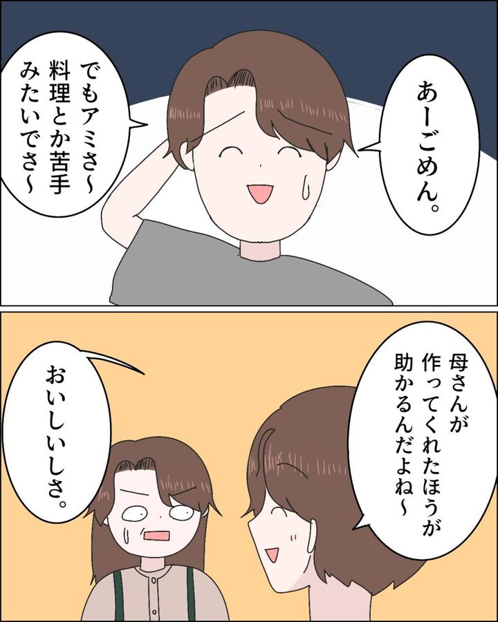 すると苦笑いのショウが「あーごめん。でもアミさぁ、料理とか苦手みたいでさ~。」と言いました。「母さんが作ってくれた方が助かるんだよね~、おいしいしさ。」と図々しく言ってきたのです。今まで何を食べてたのよ!?朝も昼も、ご飯どうしてたの!?特にコウくんのごはんは栄養を考えないとなのに!いろいろな思いが駆け巡りました。