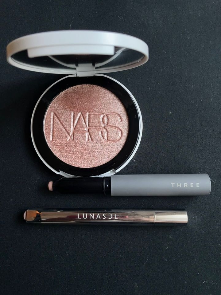 見た目はキラッキラなパールでかなり華やかな印象ですが、絶妙にピンクを帯びたカラーが大人の肌になじみ、自然な輝きを与えてくれるNARSの新作が大優勝。パウダーでありながら粉質がかなりしっとりしているので、粉飛びせずにピタッと肌にフィットしてくれます。鼻筋や鼻先に軽くのせるのはもちろん、指でまぶたにザッとのせるだけで、目元にラフなヌケ感が出るんです。