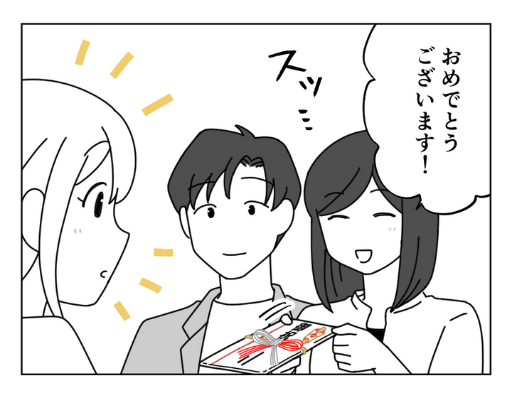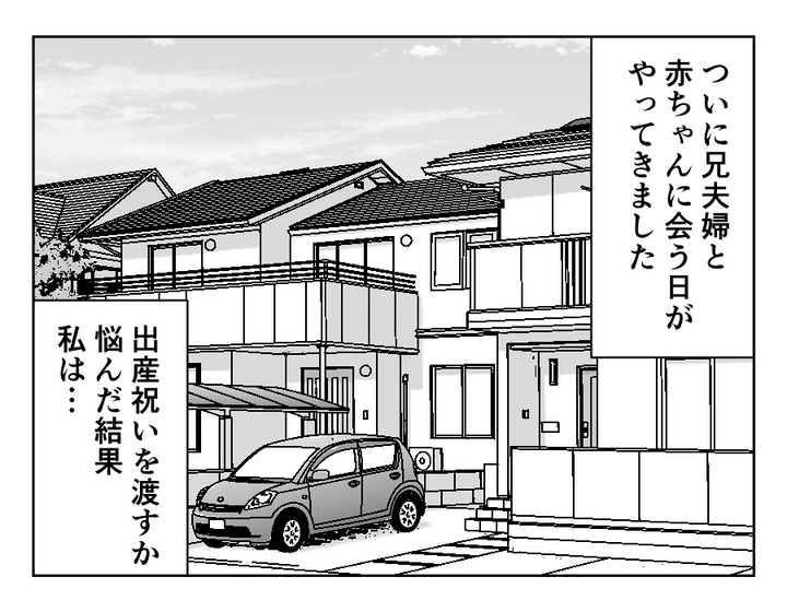 ミズキさんの兄・ケイシさんは、奥さんのエリナさんに内緒でミズキさんの夫・リョウイチさんにお金を借りています。しかし最近、赤ちゃんにお金がかかるからと返済をしてくれません。そんな中、ケイシさん夫婦が生まれてすぐの赤ちゃんを連れてミズキさんの家へ来ることに。借金を返してくれないケイシさんに出産祝いを渡すべきか、ミズキさんは悩んでいます。