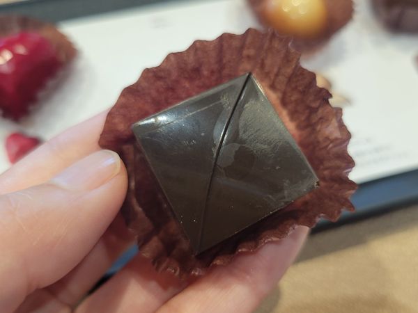 甘酸っぱいフランボワーズのコンフィチュールとフランボワーズガナッシュが印象的な一粒。赤いハート型が目を引きます。まずはフランボワーズが口いっぱいにひろがり、徐々にショコラのおいしさが香ります。