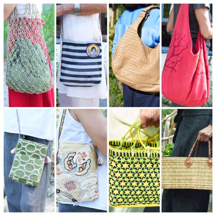 シンプルな洋服に合わせるバッグは、ハワイやタイなどのリゾート地で買ったものや、ヨーロッパのテキスタイルと古い帯で作ったポシェットなど、個性的なものばかり。台湾のメッシュバッグにシュールなアップリケをつけるなどの大人のおしゃれ心に注目。
