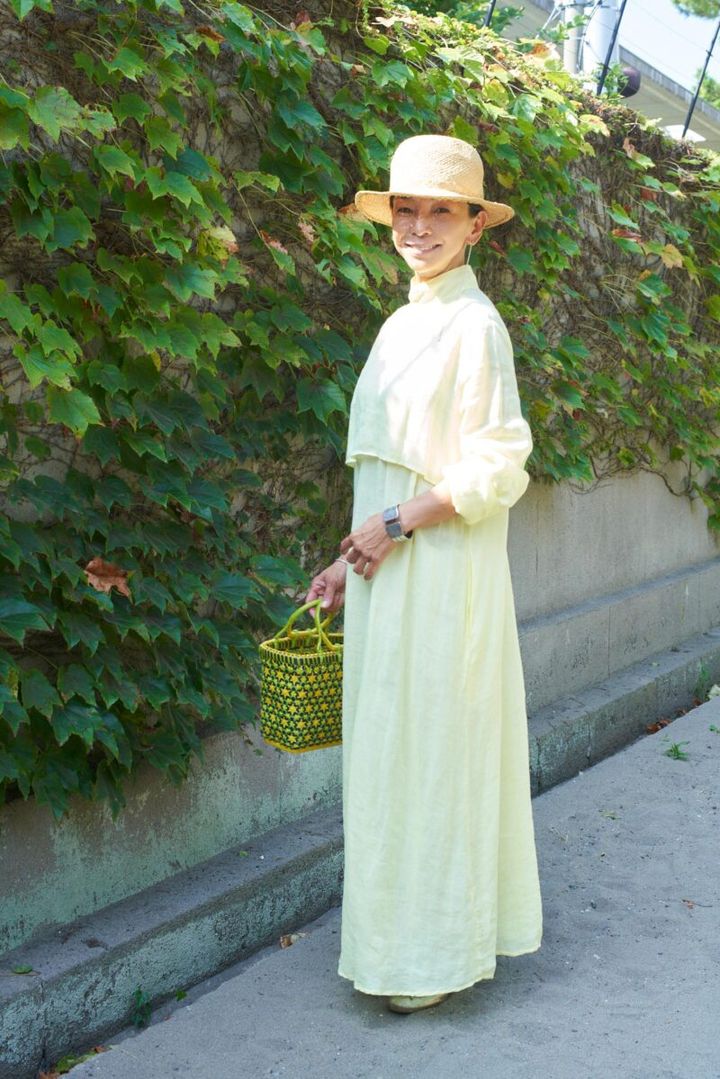 全体を淡いイエロー系でまとめた上品な装い。スタンドカラーとホルターネックがおしゃれな2wayワンピースは、「展示会や小さなパーティなどに着ていきます」(山根さん)。チェーンピアスやメルカドバッグでモード感をプラスして。