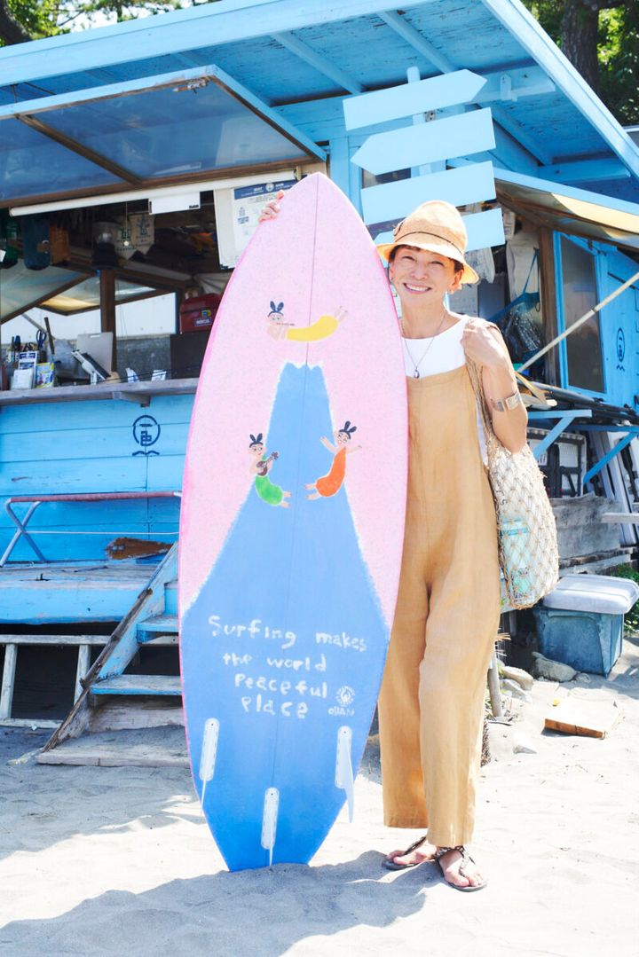 山根さんの日常は、夕陽のきれいな日は浜辺で過ごしたり、波のいい日はサーフボードを抱えて波に乗ったり、ウクレレを弾いたり、と、豊かな自然と共に暮らしています。日々のコーデは、シンプルなカジュアルが中心。リネン、シルク、コットンなど上質な素材をワントーンにまとめることで、すっきりとセンス良く見えます。週末はシーンに合わせて、マキシワンピースや着物でドレスアップ。帯揚げにエルメスのスカーフを合わせるなど、ひねりの効いたおしゃれがお手本になります。