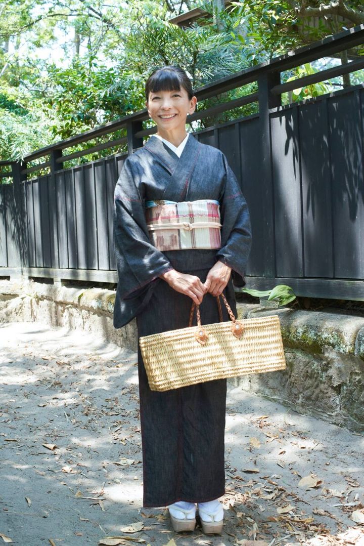 山根さんが主宰する茶道ユニット「希茶〔kisa〕(キサ)」オリジナルのデニム着物。「半衿を白にすることで、デニムのカジュアル感がラフに転ばず、ちょっと洗練された印象になります」と山根さん。エルメスのスカーフを帯揚げに見立てるなど、小粋な着こなしに注目です。