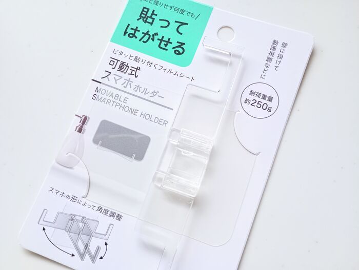 折りたたみ式のスマホホルダーがついた、ちょっと変わったフックです。こちらはセリアで購入しました。