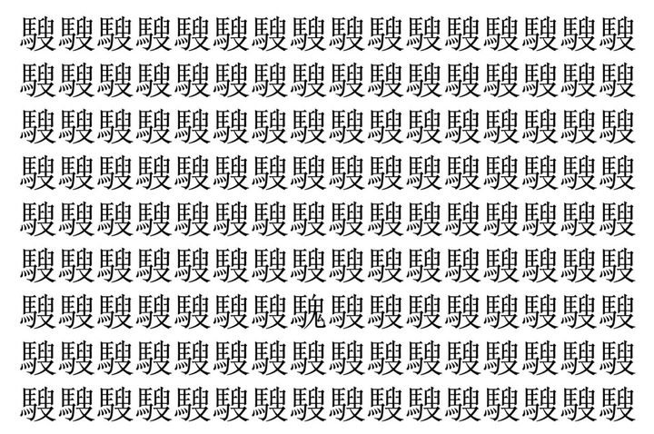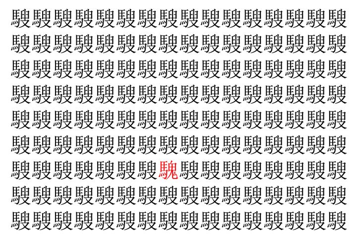 画像の中には、「騪」という漢字が縦に9行、横に16個並んでいます。 全部で144個となりますが・・・、そのうち1つは「異なる漢字」となってますよ!!