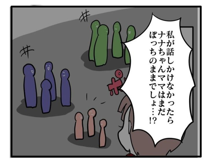 主人公のナナちゃんママは、子どもが同じ幼稚園に通うジロウくんママに強い執着心をいだかれ困っていました。そもそも集団行動が苦手なナナちゃんママは、選んで1人でいたのですが、その様子を目にしたジロウくんママがある日声を掛けてきます。