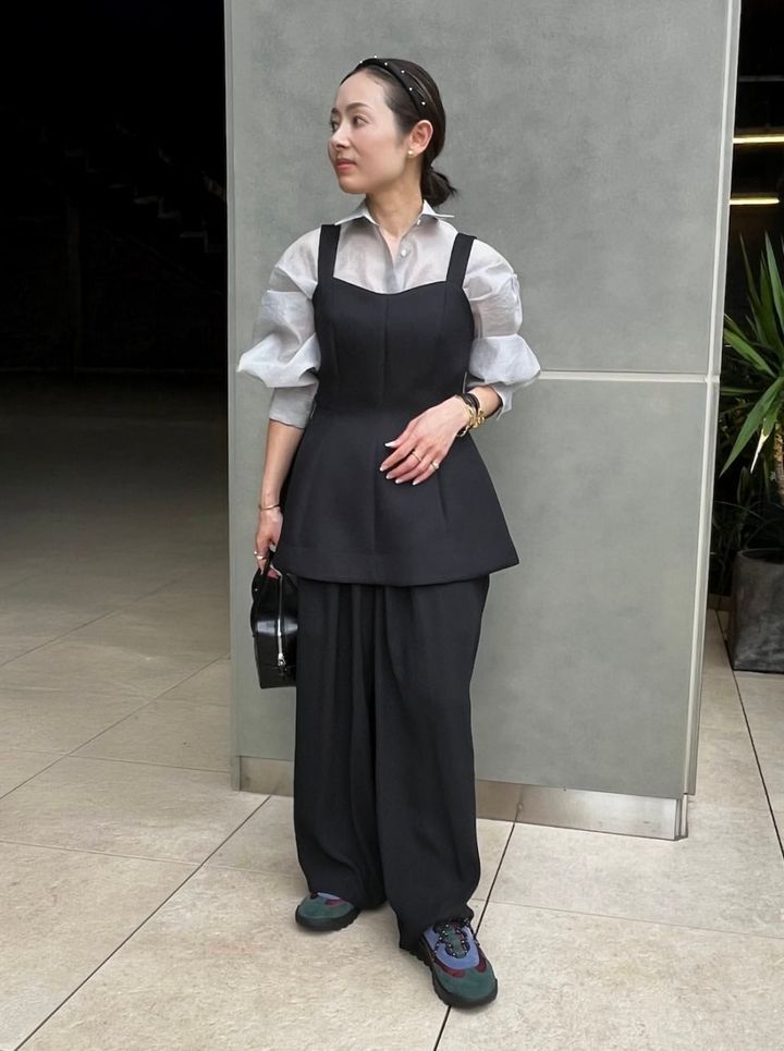 「フェミニンなアイテムを引き立てる秋のスニーカーコーデ。154cmと低身長ですがキャミソールの立体的なフォルムでカバーし、下にシアーシャツをレイヤードすることでカジュアルになり過ぎないよう意識しました。キレイめなイージーパンツを合わせることで大人が着るフェミニンコーデに仕上げています」