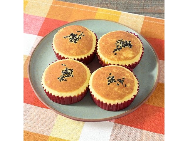 紅はるかの焼きいもペーストを使用した、しっとり食感のスイートポテト風蒸しケーキです。黒ごまをトッピングし天面を焼くことで、香ばしさと見た目のスイートポテトらしさを表現しました。