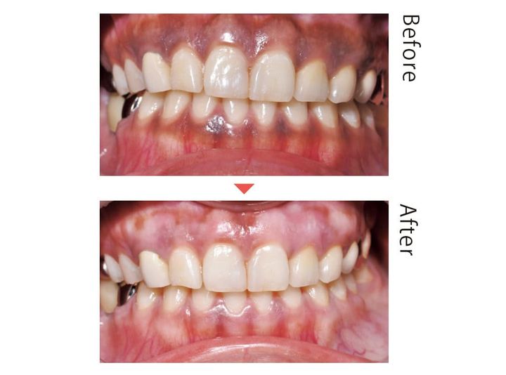 40代気になるのは…歯の色だけじゃない! 歯をホワイトニングしても口元の印象が暗いなら、歯茎の色に注目。紫外線や喫煙、口呼吸、食物の刺激などの原因により、メラニンが生成されて黒ずんでいるかも。約1週間のダウンタイムを経ると、血色のいい若々しいピンク色の歯茎に。