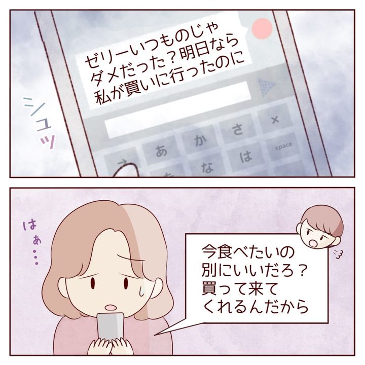 「ゼリーいつものじゃダメだった?明日なら私が買いに行ったのに」とマサキにメッセージを送ると、「今食べたいの。別にいいだろ?買って来てくれるんだから」と不機嫌そうなメッセージが返ってきました。