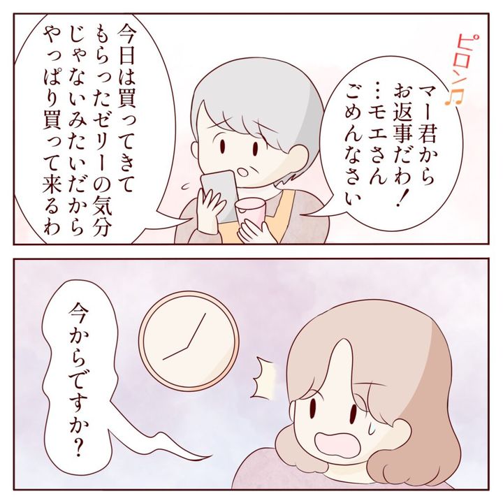 すると、ピロン「マー君からお返事だわ!・・モエさんごめんなさい。今日は買ってきてもらったゼリーの気分じゃないみたいだから、やっぱり買って来るわ」と義母が言ったのは夜の8時過ぎ!「今からですか?」と驚いてたずねると、