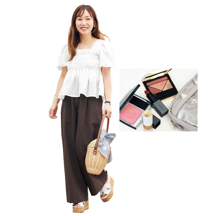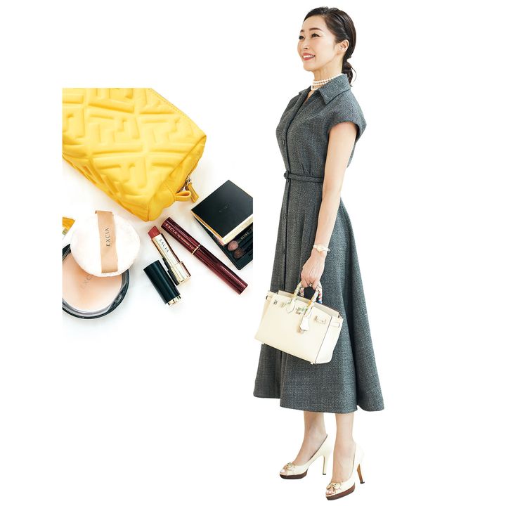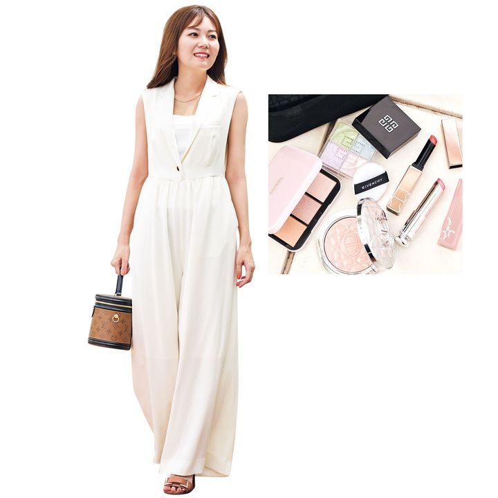 ピンクのツヤで頰を染めるディオールスキン ルージュ ブラッシュ212は、誰でも可愛くなれる魔法のチーク。プラダのピンクベージュのアイシャドウ08で瞼にも追いツヤを。エルメスのリップバーム27とTHREEのリップスティック06で甘さと品を足します。