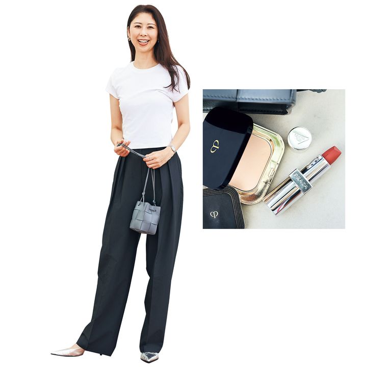 適度なカバー力と自然なツヤを与えてくれるクレ・ド・ポー ボーテのトリートメントパウダーでベースメイクを仕上げ、保湿力の高いプラダのリップ バーム オプティマイジング ケアU011でナチュラルな血色感をプラス。あれこれ使わずこの2品だけでヘルシーフェイスに仕上げています。