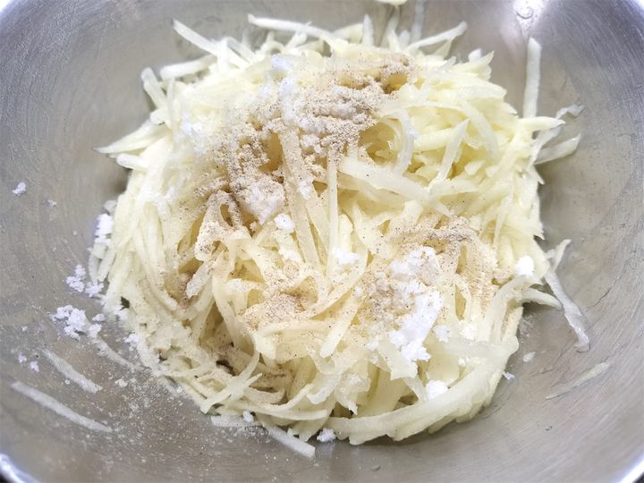 1. ボウルにじゃがいもを入れ、塩とこしょうを振って混ぜます。
