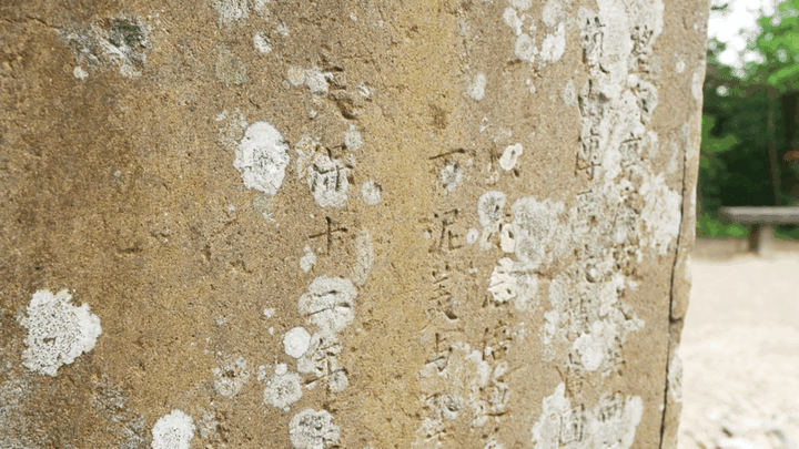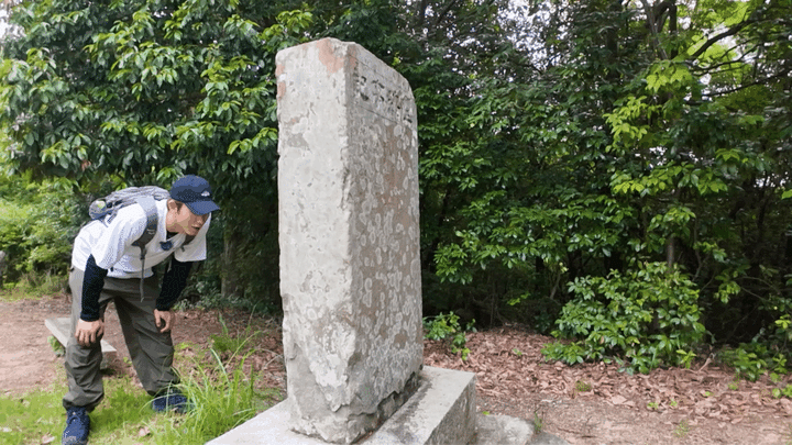 整備されているコースは全部で5つ。今回は、距離は短いながら傾斜が急な、登り応えのある「望海亭コース」に挑戦することに。阪急池田駅から商店街を抜けると登山口へと続く道が見えてきます。ほどなくして始まった登山道はまず、階段から。15分も歩くと旧望海亭跡に到着です。今でこそ木々にまわりを囲まれて眺望はありませんが、室町時代には禅修行のための建物があり、かつては大阪湾まで広く望むことができたといわれています。それが「望海亭」の名前の由来なんだとか。その跡地に残る碑には天保12年(西暦1841年)の文字が刻まれていました。