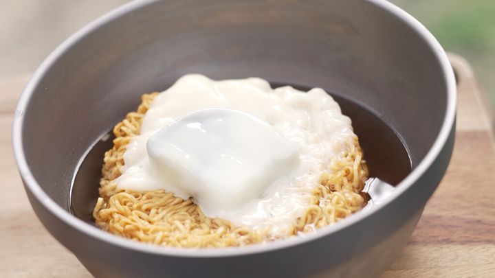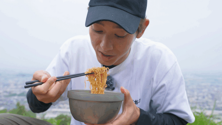 神社を出発したらあとは一気、途中、舗装路もありほどなくして三角点のある山頂に到着。314.9m、残念ながら木に囲まれて眺望は無し。ということで市街が見渡せる南斜面の展望エリアへ移動。いよいよ頂きメシの時間です。今回用意したのはみんな大好き「チキンラーメン」のアレンジ料理!そう、ここ池田市は、インスタントラーメン生みの親である安藤百福氏が、チキンラーメンを発明した自宅があった街なのです。では早速調理開始!近藤さん、どんぶりにチキンラーメンを入れ、「たまごポケット」にカレーのルーを投入、スライスチーズを被せてお湯を注ぎます。あとは3分待って完成。山歩きの後なのでカロリーは気にせず「頂きメシ、いただきます!」