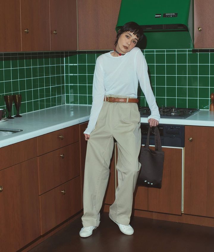 ★パンツ¥13,000、★ベルト¥6,500(共にベランダ 表参道)、ロングTシャツ¥7,920(ビューティー&ユース/ビューティー&ユース ユナイテッドアローズ 丸の内店)、首に巻いたニットベルト¥8,250(ジェーン スミス/ジョン メイソン スミス ジェーン スミス ストア)、バッグ¥17,600(SEA/エスストア)、スニーカー¥9,350(ムーンスター/ムーンスター カタスマーセンター)、その他はスタイリスト私物