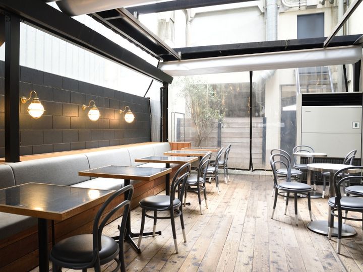 改装の際に新設したテラス席は開閉式の屋根付きで、雨天時にも利用可能。建物の裏側を見ることができる穴場スポットです。