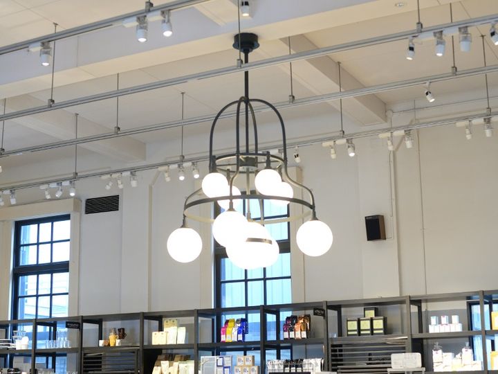 重厚なシャンデリアは当時のものではなく、改装に際して特別に制作したもの。モダン建築の雰囲気とマッチしています。