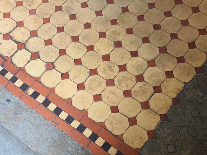 店内に入ってすぐの床タイルは竣工当時のものを、そのまま使用しています。赤地に黄色い八角形が敷き詰められ、シンプルながら印象的なデザインです。