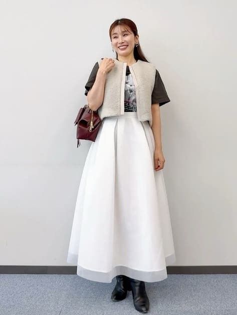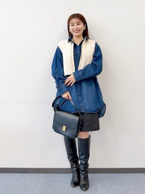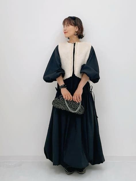 「ボアのジレを投入するだけで一気に秋モードへ。短丈が重心アップ!レイヤードしてもスタイルが良く見えるのも嬉しいポイント。半袖にも、長袖にも羽織れます。デニムシャツ×ボアはカジュアル度が増してアクティブな印象に。バルーンワンピには短め丈のジレを合わせてスタイルアップ♪」
