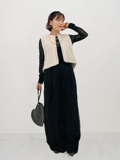 「ブラックワンピにボアのジレを羽織って綺麗めに。女子会ランチなどのシーンにぴったり!」