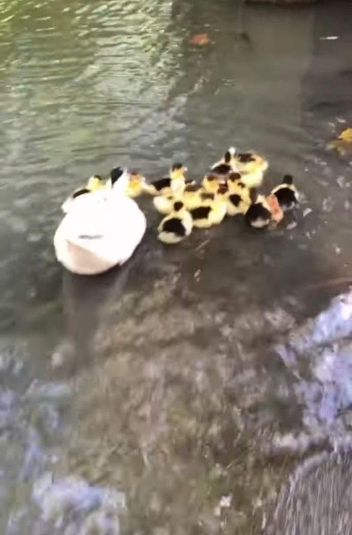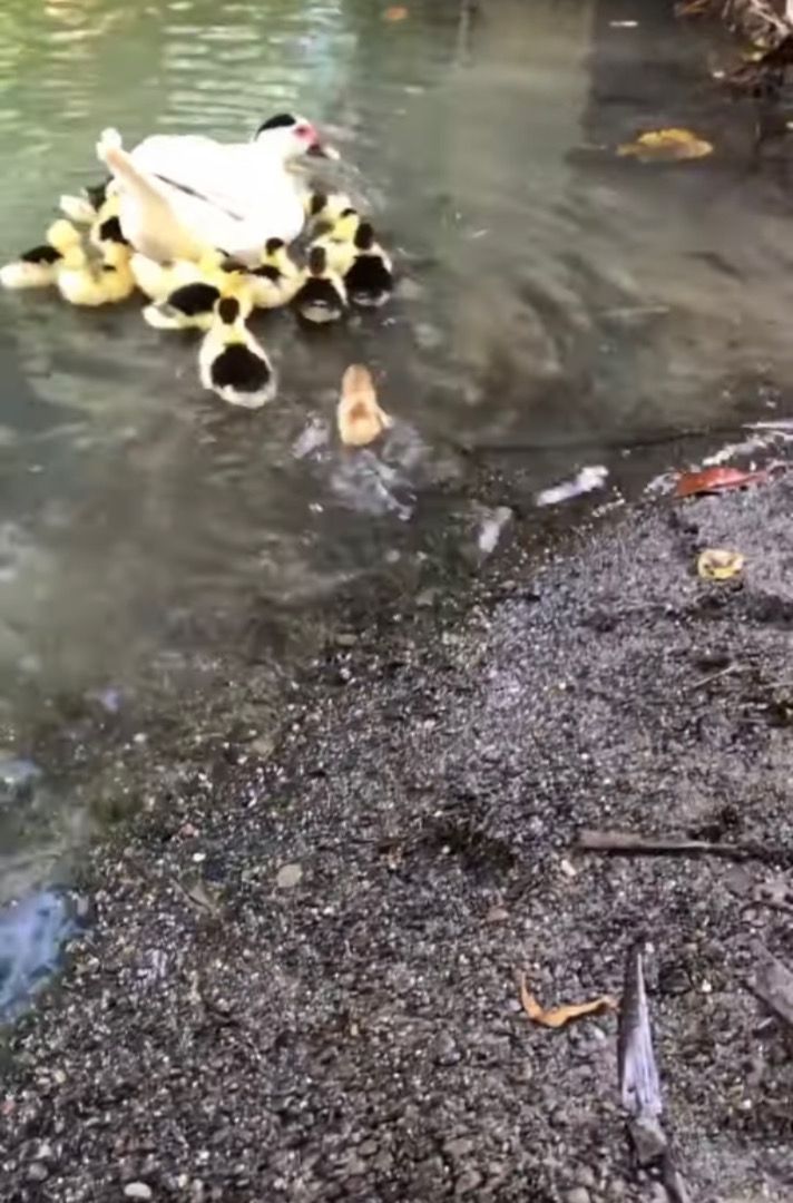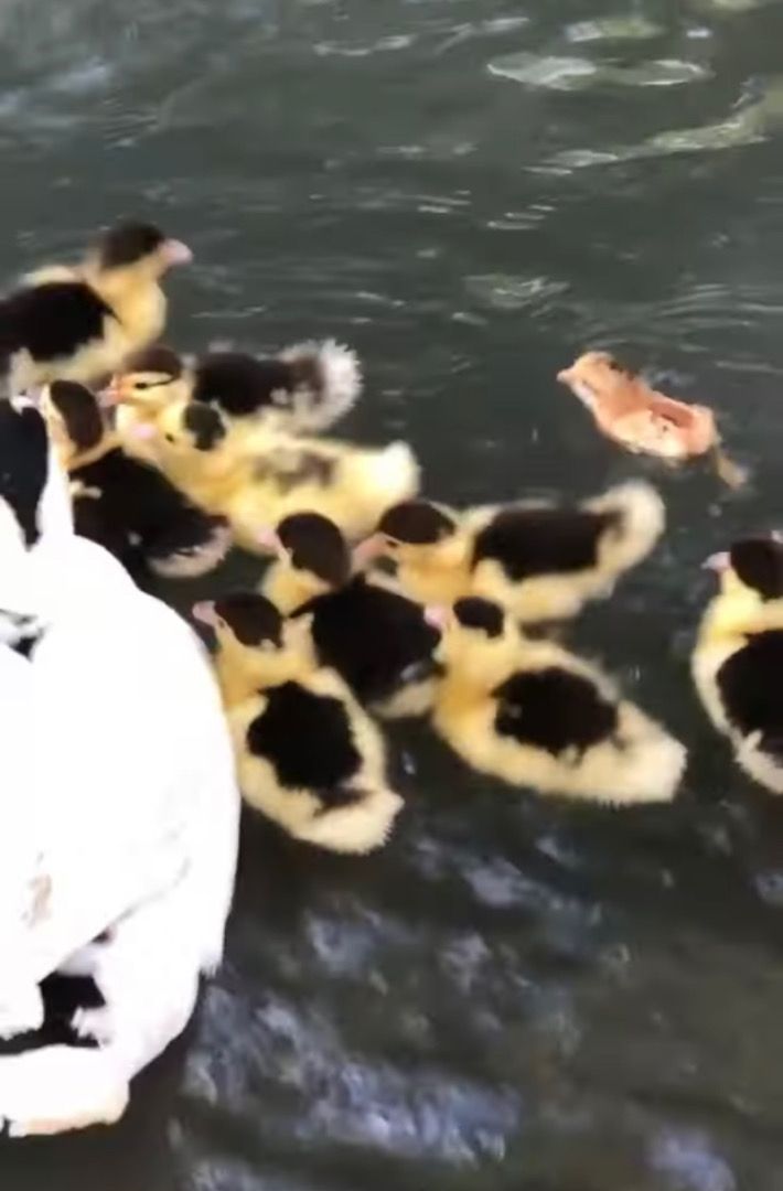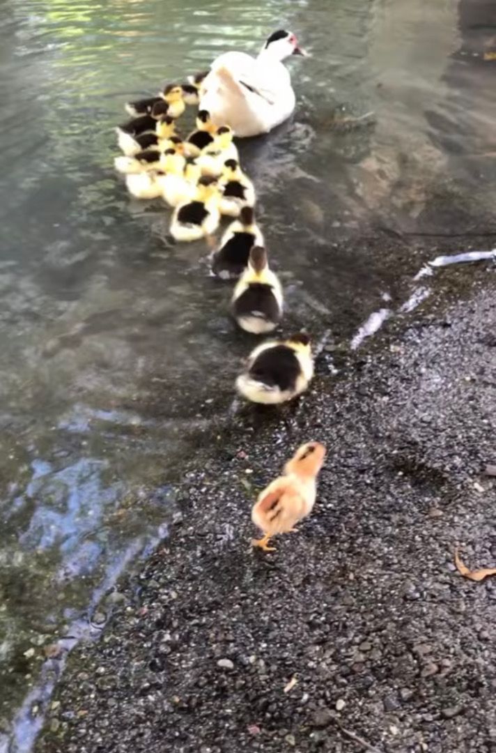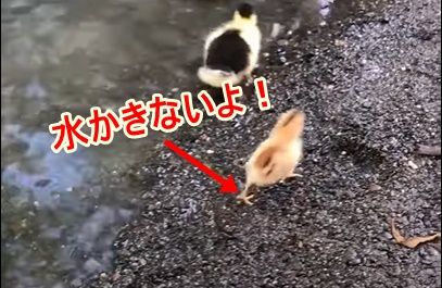 ヒナたちの後をついてきたこのヒヨコは、躊躇うことなく自分も水の中にダイブ。 まさか、自分のことをアヒルだと思っているのでしょうか。