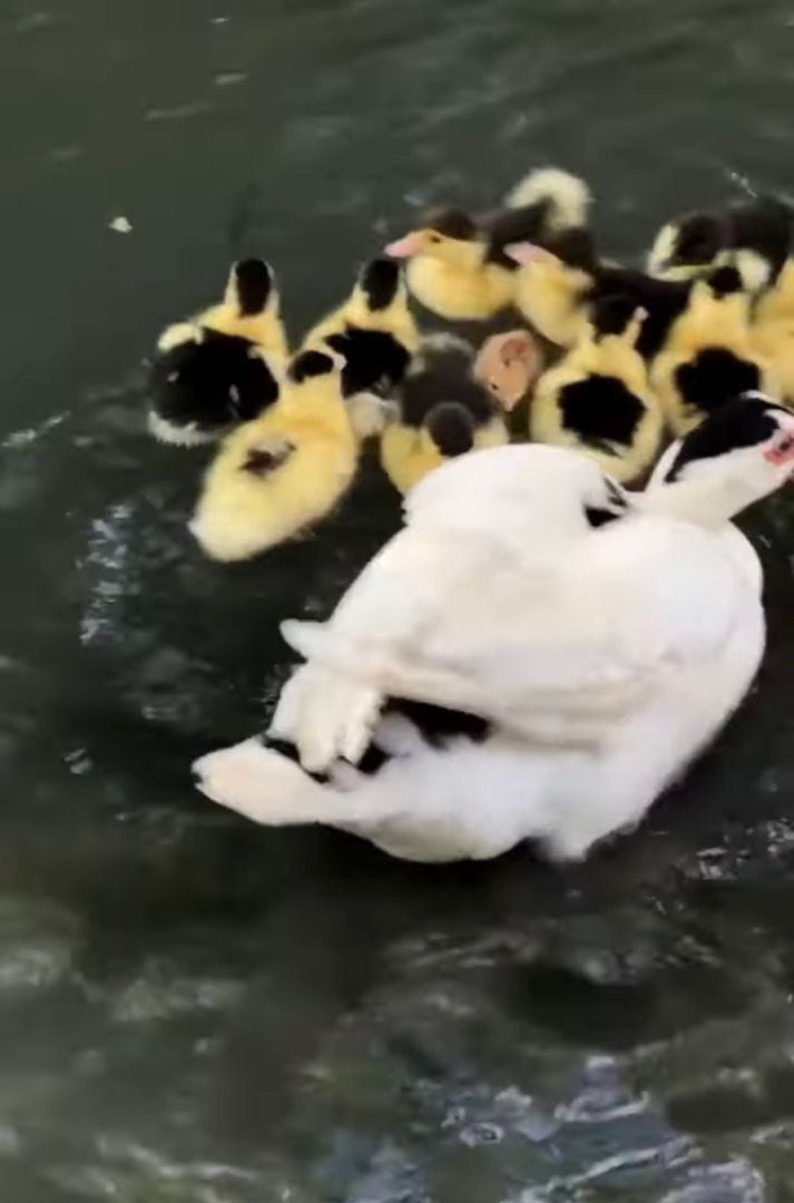 泳ぐアヒルの親子の中に一羽紛れ込んだヒヨコ。 自分も親子の一員かのように一緒になってスイスイ泳ぐヒヨコの姿は、こちらの動画からご覧いただけます。