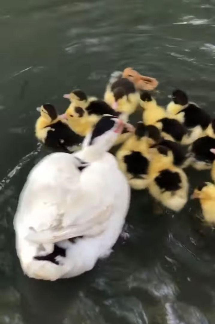 3. 君!泳げたんだね!?泳ぐアヒルの親子の中に一羽だけ紛れ込むかわいい子が!