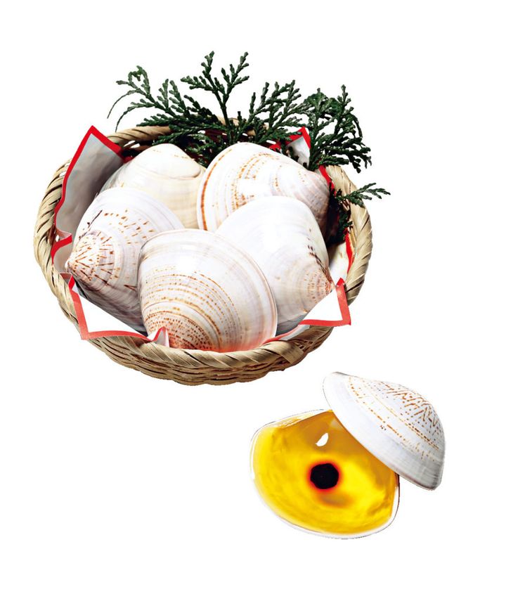 桧葉を添えたざるに並び入れられた蛤。潮風を運んできそうな風流な一品は、初代店主が夏でも日持ちがするお菓子をと考案されたもの。貝を開けると現れる、澄んだ琥珀色の寒天が涼しげです。一粒入れた浜納豆のほんのりとした味噌風味が甘さの中のアクセントに。