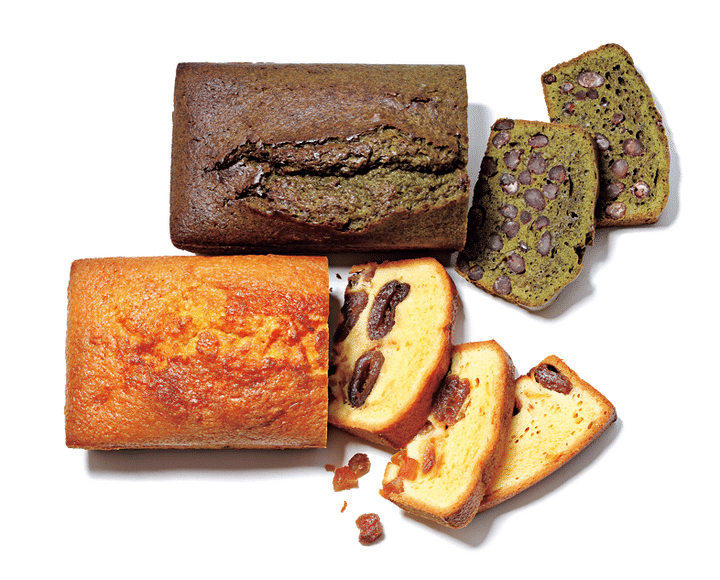 昨年末にオープンした、京都・鷹峯にあるパウンドケーキ工房。素材はもちろん、室温などにもこだわって丁寧に焼き上げた生地はきめ細やか。ラム酒漬けのドライフルーツや甘納豆入りなど全8種類のラインナップに加え、京都らしい季節の味も登場予定。 上から、抹茶と小豆のパウンドケーキ、ドライフルーツのパウンドケーキ各¥2,300(ともに税込み、送料別途)