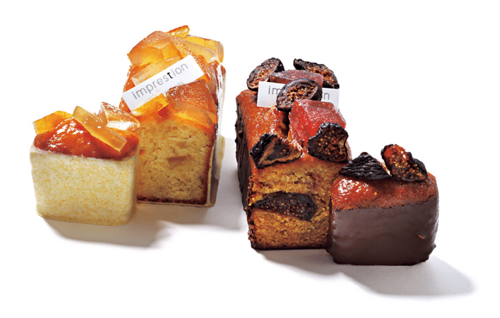 常時16種類、季節のフレーバーが加わって年間では30種類ものケイクが登場するパティスリー。糸島や唐津の農家から届く果物、オーガニックの卵や牛乳を中心に使い、素材の風味を活かしたしっとりケイクは、華やかなヴィジュアルに目移りしそう。 右から、黒いちじくとキャラメルのケイク¥1,800、ケイクシトラス¥1,450(ともに送料別途)