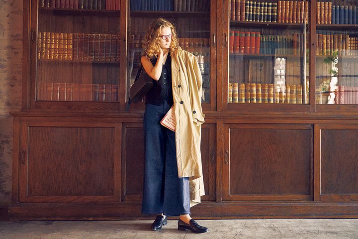 白ノースリTシャツ/MIESROHE(MIESROHE ルミネ新宿1店) インディゴデニムパンツ/A.P.C.(アー・ぺー・セー カスタマーサービス) 黒ベスト/THE SHINZONE(Shinzone ルミネ新宿店) 肩にかけたベージュコート/チノ(モールド) 眼鏡/プロポ(プロポデザイン) バッグ/nuer(ショールーム ロイト) ローファー/A de Vivre