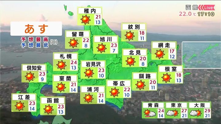 函館のきょう29日(月)の最高気温は9月上旬並みの24.3度でした。あす30日(火)もこの時期としては暖かく、さらに朝から日差しにも恵まれます。