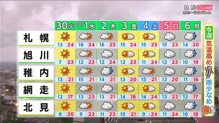 10月1日の水曜は雲に覆われ、日高地方など一部で雷雨となるおそれがあります。木曜から土曜は晴れ間が出ます。気温は今週いっぱい高めで、日中は22度前後と過ごしやすいでしょう。