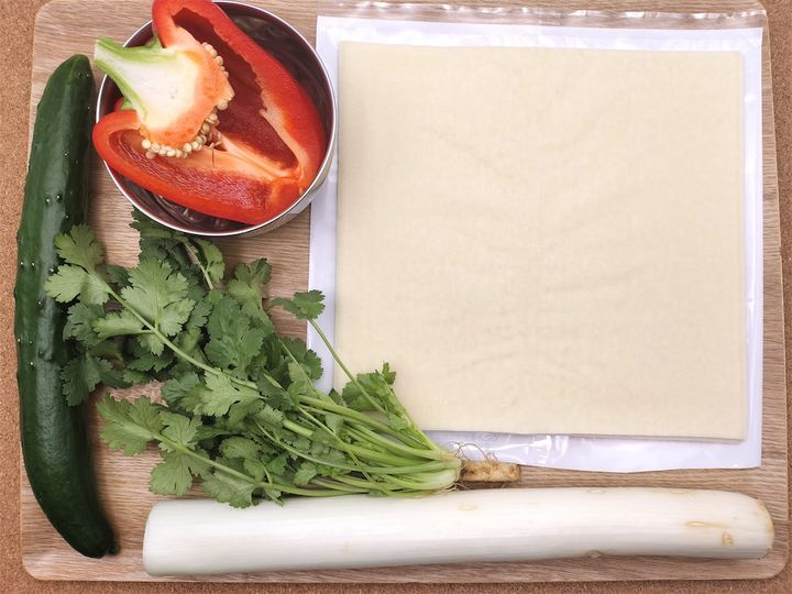 このレシピでは春巻きの皮を生で食べますが、春巻きの皮には生で食べていいものとそうでないものがあります。加熱処理していない春巻きの皮は生食には不向きですので、購入するときは必ず説明書きをよく確認して適切なものを購入するようにしましょう。
