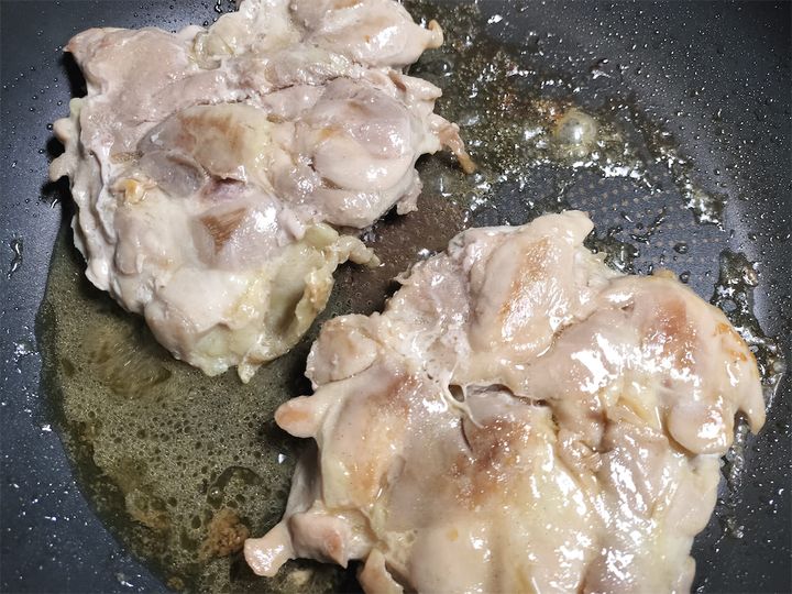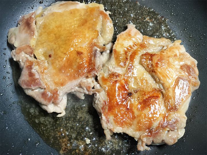 2. フライパンにゴマ油を引いて中火の弱にかけ、鶏肉の皮目を下にしてフライパンに乗せます。上にアルミホイルを敷いてフライパンなどの重しを乗せて、肉を平らにして7分焼きます。