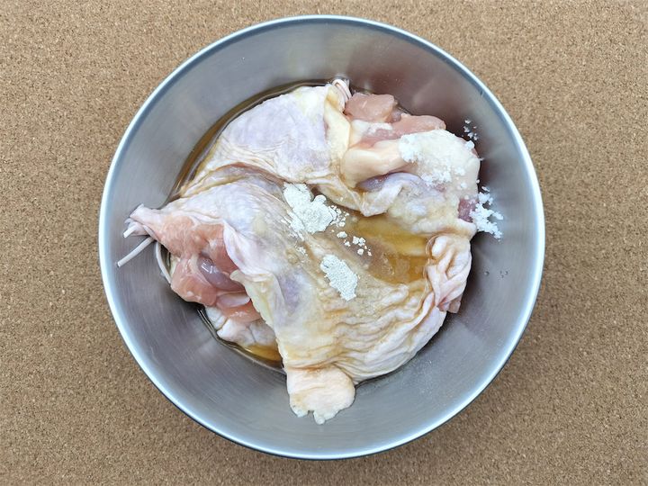 1. ボウルに鶏肉、塩、こしょう、紹興酒を入れてよく揉み、下味をつけます。