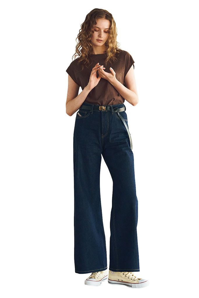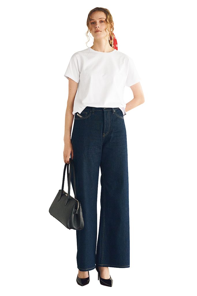 白Tもデニムも美形なフォルムを貫いて「自信が持てるシンプル」へ。デニムはワイドシルエットの存在感を生かす、ウォッシュやクラッシュなど加工感のないシンプルな1本。ルーズなフォルムなのにウエストやヒップまわりはコンパクトだから、後ろ姿まで抜かりなくすっきりと。ハリのある生地は、脚線をまっすぐ見せるだけでなく、穿くほどに味わいが出る風合い。 インディゴデニムパンツ/DIESEL(DIESEL JAPAN)