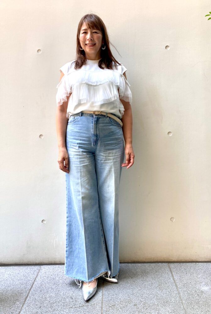 素敵なあの人のイベントに、大阪から参加をしてくださった石川さん。「たくさんの方が集まるイベントなので、お気に入りのブランド『グレースコンチネンタル』でスタイリング。デニムは、淡色をセレクト。味のある色落ちがある分、センタープレスがあってくだけすぎないものを選び、縦ラインで脚長効果も!トップスがひらひらしているので、ボトムスで締めて甘辛ミックスコーデにしています」