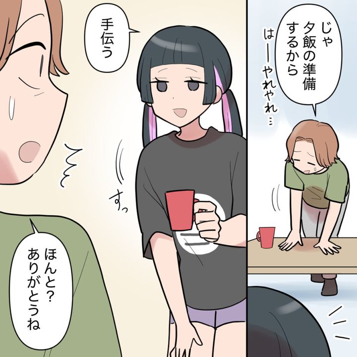 二人に伝えるべきことをひとまず全部伝え終えた私。「じゃ、夕飯の準備するから」と立ち上がると、エリカちゃんが「手伝う」と当然のように言ってすっと立ち上がりました。「ほんと?ありがとうね」私は驚きつつも、エリカちゃんは家でもいつもおばあちゃんのお手伝いをしているんだろうなと感じました。