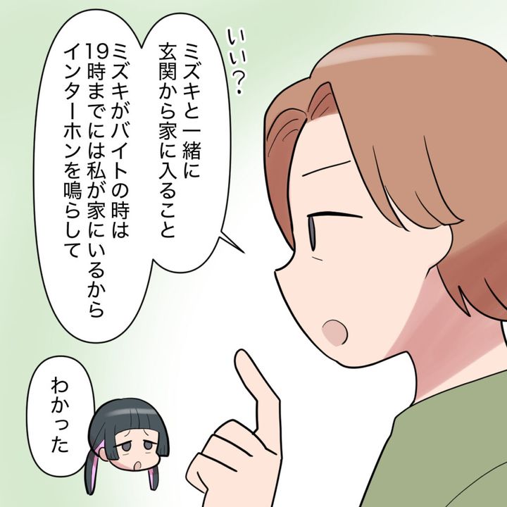 私は「いい?ミズキと一緒に玄関から家に入ること。ミズキがバイトの時は19時には私が家にいるからインターホンを鳴らして」と真顔で伝えると、エリカちゃんは渋々「わかった」と納得してくれました。