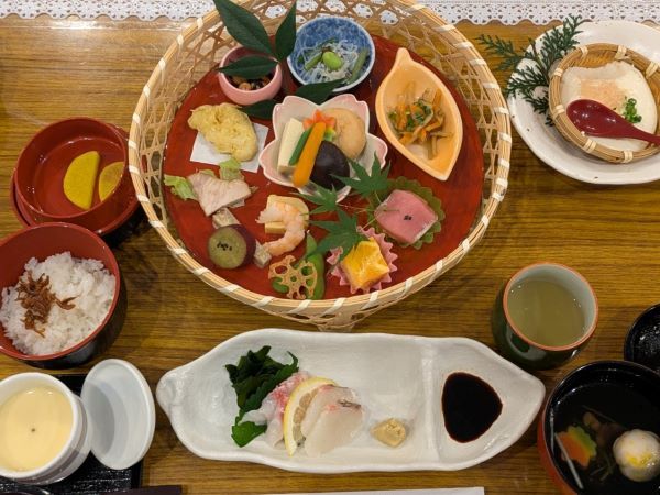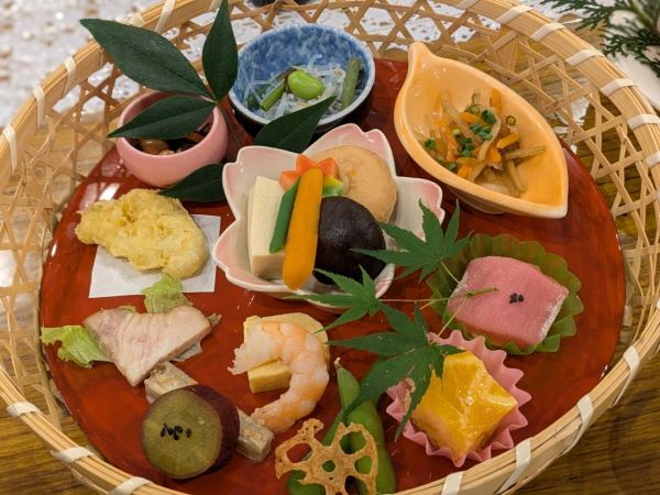今回いただいたのは、会席料理の「花かご膳」(2200円)。予約の時間にこちらが準備されていました。彩り鮮やかで、芸術の秋にぴったりなお料理です。