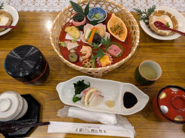 花かごには、酢の物・煮物・炒め物・天ぷら・焼き物などが美しく盛り付けられていて、食べるのが勿体ないくらい。どれも優しい味付けで、地元食材を使用した心のこもった品々です。デザートのみかんのケーキとさつま芋あん入りのお餅も、ほっとする味わいでした。