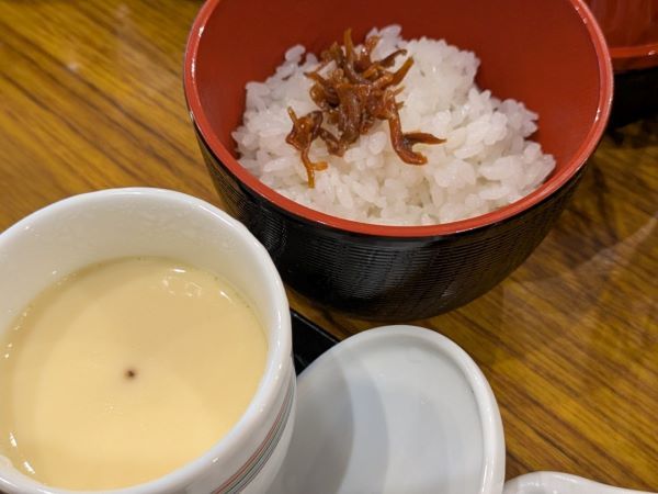 熱々の茶わん蒸しも、ホカホカご飯に乗っている山椒の実とじゃこの佃煮もおいしくて、思わずご飯をお替りしちゃいました。2膳目にも佃煮という嬉しいサービスも♪