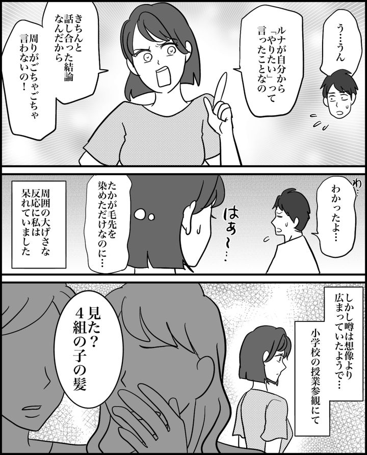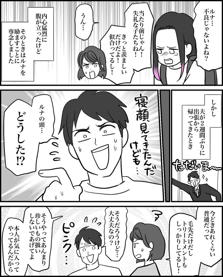 2週間の出張から帰ってきた夫は、ルナの髪を見てギョっとしていました。別に髪全体がピンクなわけじゃありません。たかが毛先をちょっと染めたくらいで、こんなに大げさに騒がれるなんて……。周りの反応は私にとって予想外のものでした。